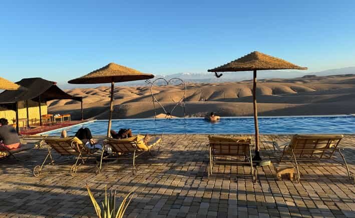 Expérience VIP au Désert d’Agafay : Déjeuner, Accès Piscine, Quad & Dromadaire